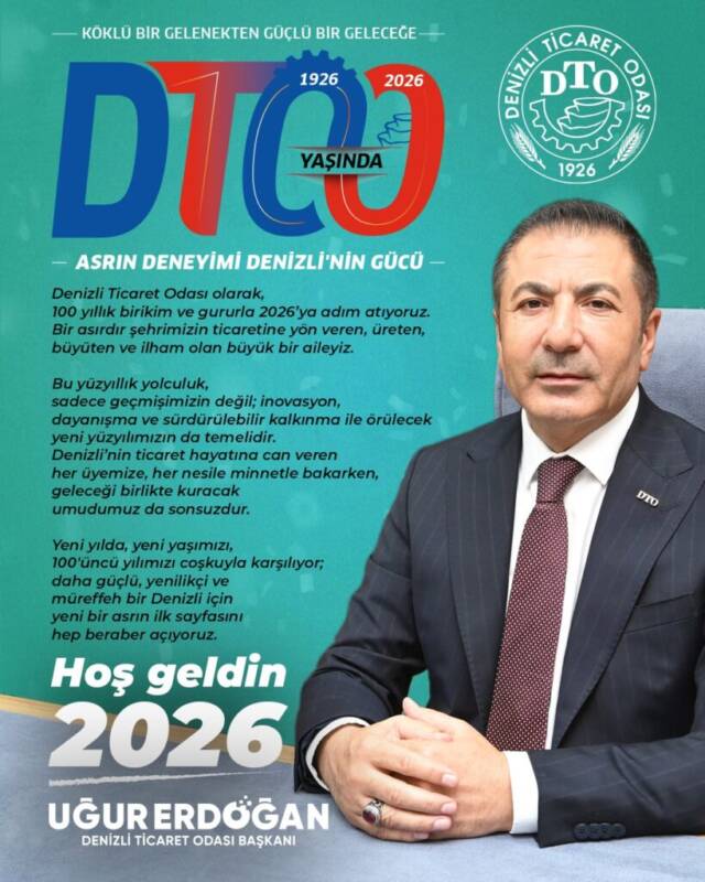 Denizli Ticaret Odası (DTO) Başkanı Uğur Erdoğan, 2026 senesinin; üretimin, istikrarın ve ortak aklın yılı olmasını temenni etti; halkın yeni yılını kutladı. Başkan Erdoğan, yılbaşı mesajında “Yeni bir yıla daha umutlarımızı, hedeflerimizi ve geleceğe dair inancımızı tazeleyerek giriyoruz. 2026’nın; ülkemiz, şehrimiz ve iş dünyamız için sağlık, huzur ve bereket getirmesini diliyorum” dedi.